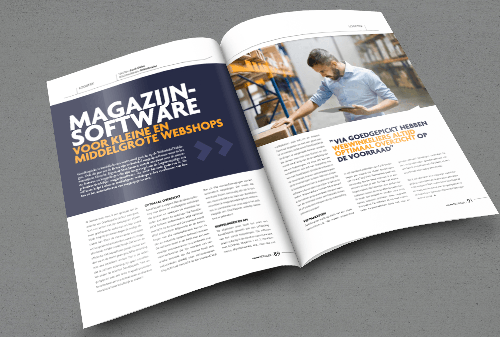 GoedGepickt webwinkel magazijnsoftware ondersteunt webwinkeliers bij het automatiseren en professionaliseren van magazijnprocessen. Beheer eenvoudig je voorraad, pick producten foutloos en verwerk bestellingen sneller. Dankzij koppelingen met alle belangrijke verkoop- en verzendkanalen bespaar je tijd, voorkom je fouten en maak je je logistiek toekomst bestendig. Wij vertellen meer over deze koppelingen, maar onze partners en koppelingen vertellen ook iets over ons. Dat niet alleen, we zijn ook in de media te zien! We laten je graag weten waar wij te zien zijn geweest, kijk met ons mee!